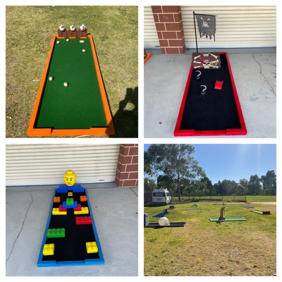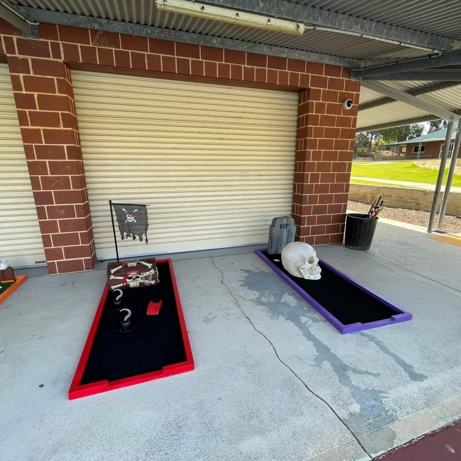 Now available for hire is our 9 hole deluxe mini golf! This is so much fun and a great non-inflatable option for schools and OSHC. This really is the best mini golf hire in Perth with it's awesome props to really look the part. This hire is for 3 hours for 9 mini golf holes, 10 rubber headed putters (in assorted sizes from kids to grown ups) and 10 high density foam balls. We use the rubber headed putters and high density foam balls for the safest setup possible.