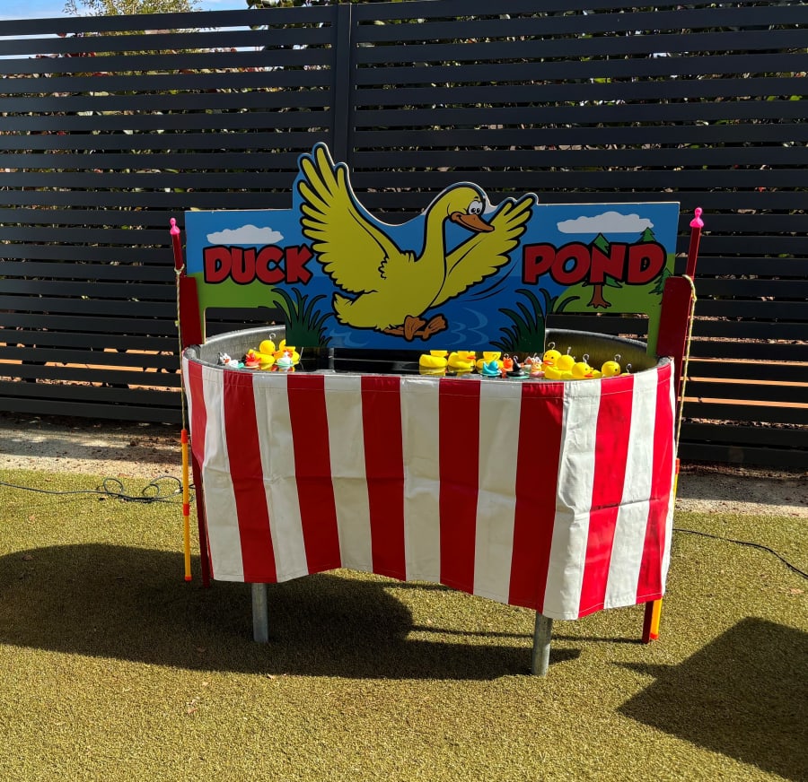 Lucky duck pond game. Comes with 2 rods for duck fishing and up to 50 cute little ducks! We have some bigger yellow ducks available and some cute littler ducks that are dressed up as ninjas, princesses, clowns, piggies and everything in between such a cute little touch for the kids :)