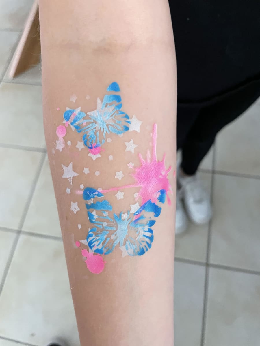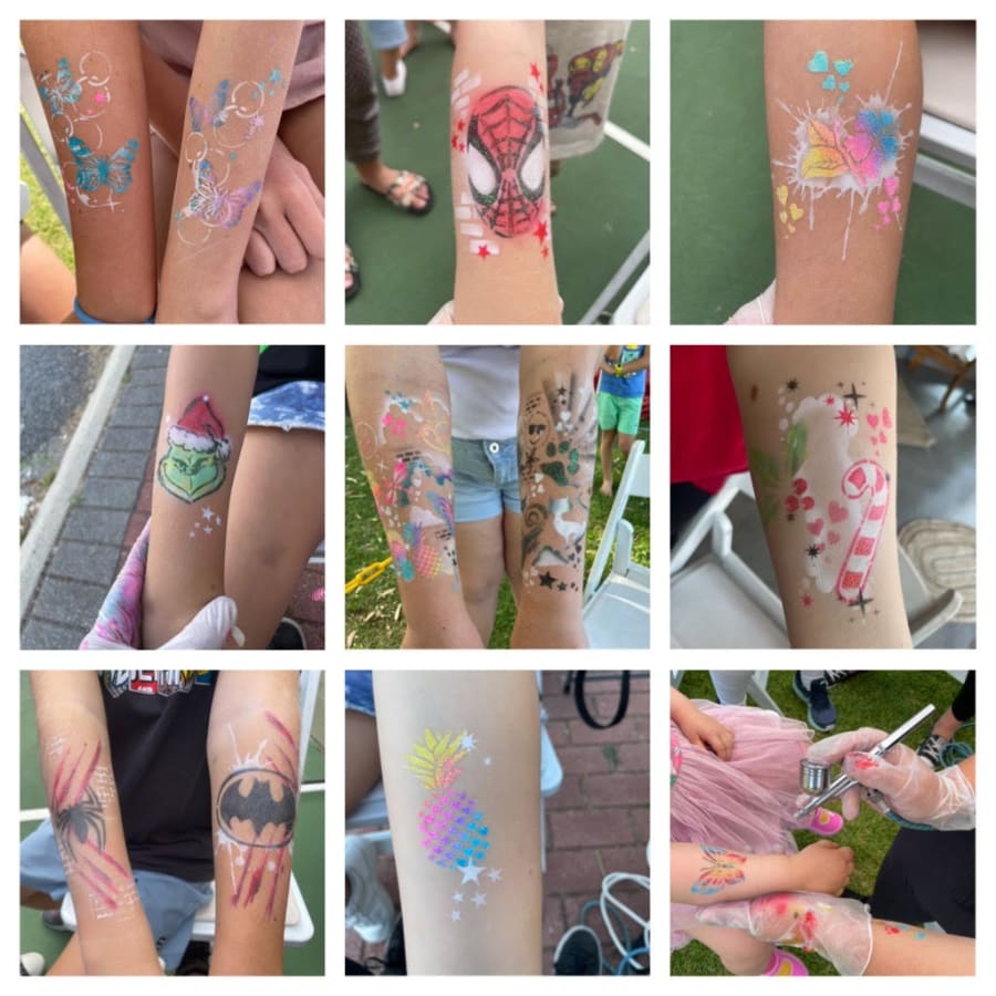 Airbrush tattoos are much quicker than traditional face painting and therefore are great for events with more kids. We can get through about 40-60 kids an hour per airbrush tattooist.