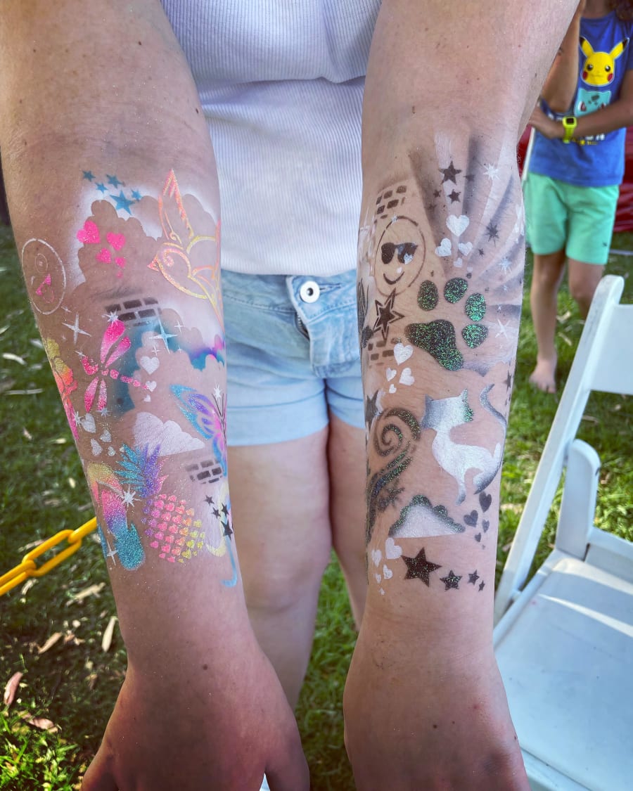 Airbrush Tattoos $145 per hour, minimum booking is 2 hours. (there may be a surcharge for 2 hour bookings if there is a lot of travel involved. We are based in Landsdale 6065)