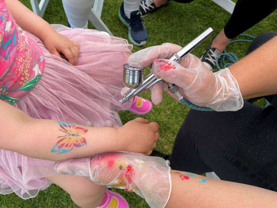 Airbrush tattoos are much quicker than traditional face painting and therefore are great for events with more kids. We can get through about 40-60 kids an hour per airbrush tattooist.