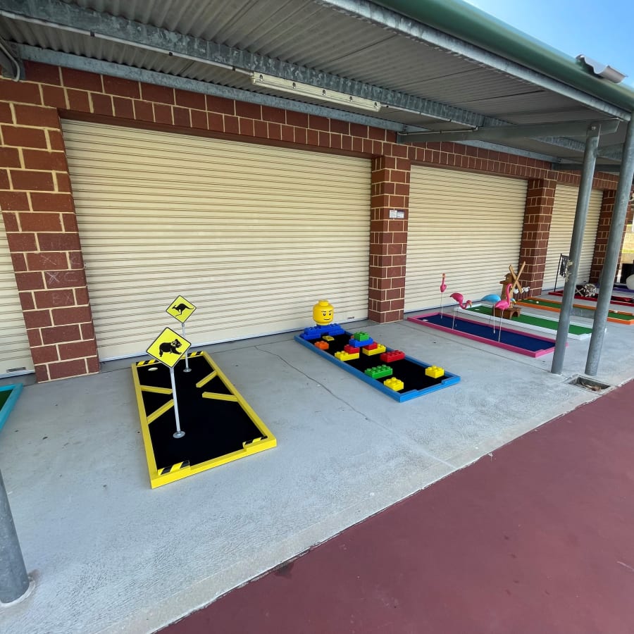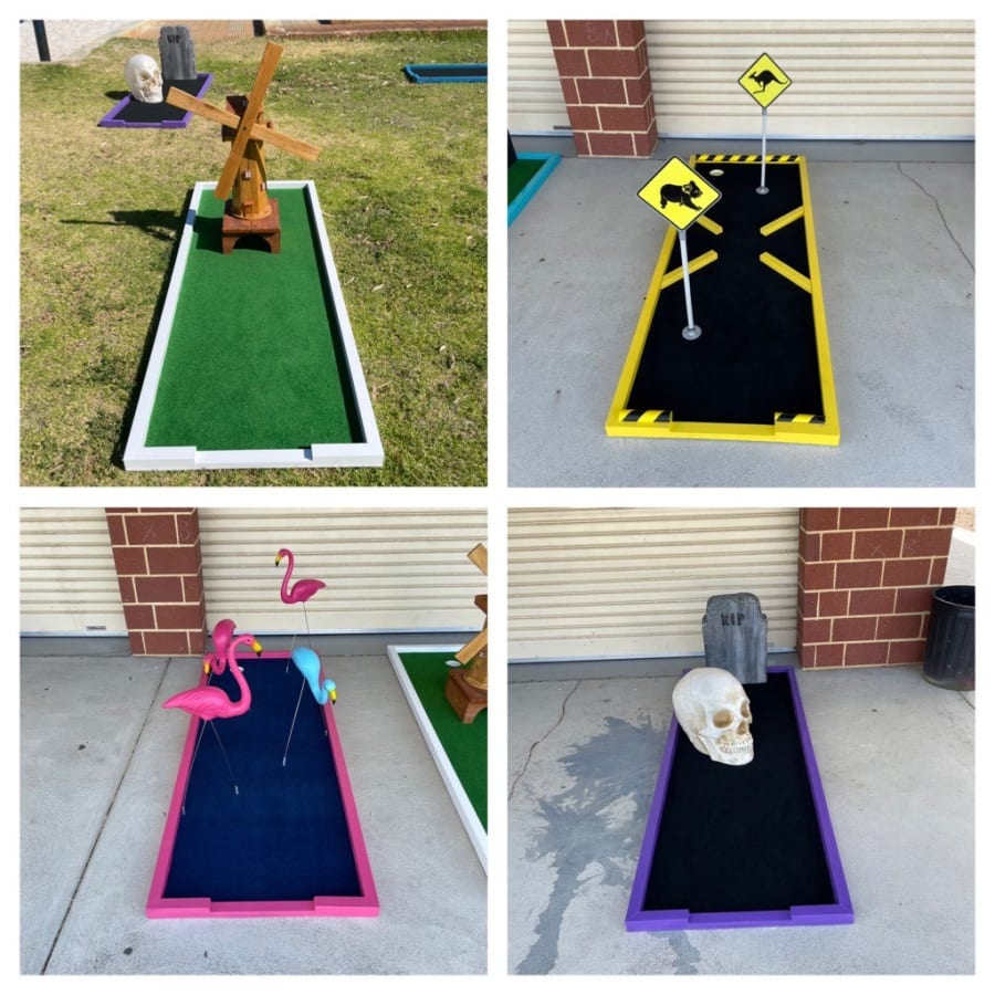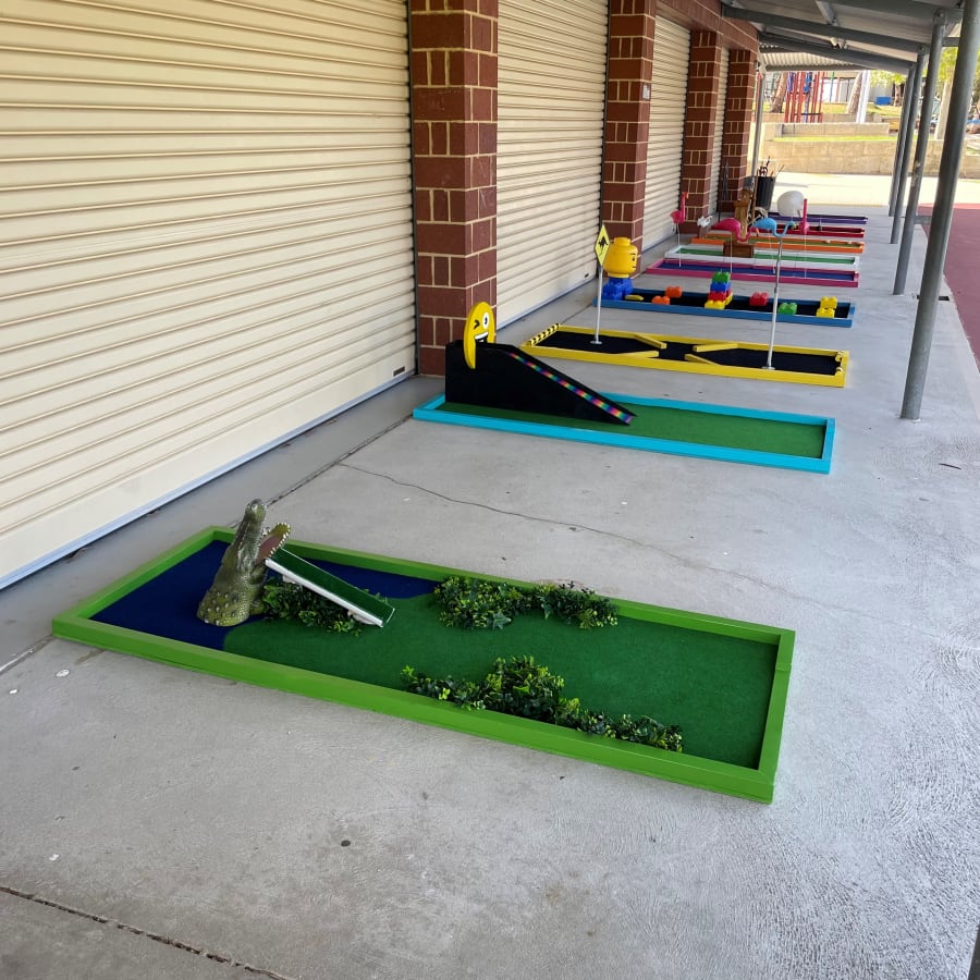 Now available for hire is our 9 hole deluxe mini golf! This is so much fun and a great non-inflatable option for schools and OSHC. This really is the best mini golf hire in Perth with it's awesome props to really look the part. This hire is for 3 hours for 9 mini golf holes, 10 rubber headed putters (in assorted sizes from kids to grown ups) and 10 high density foam balls. We use the rubber headed putters and high density foam balls for the safest setup possible.
